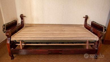 La struttura in legno con guida in ferro consente di ruotare i braccioli, abbassare lo schienale e ruotare la seduta, trasformando rapidamente il divano in un letto ad una piazza; il materasso è integrato al di sotto della seduta.