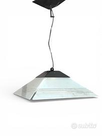 Splendido lampadario a sospensione dal design geometrico e minimale, perfetto per chi ama lo stile Postmoderno o Industrial. La struttura a piramide tronca è composta da lastre di vetro satinato di alta qualità, impreziosite da eleganti striature trasparenti orizzontali che creano un gioco di luce diffusa e raffinata.