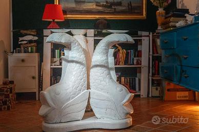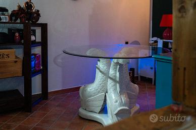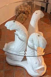 Vendo splendido tavolo rotondo con base in legno massiccio intagliato a mano raffigurante tre carpe koi. Pezzo decorativo di grande impatto, ideale per soggiorno, sala da pranzo o casa al mare.