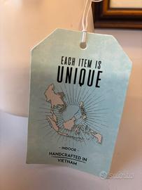 Design unico: L'etichetta sottolinea che ogni oggetto è unico, suggerendo che potrebbero esserci lievi variazioni nella forma, nelle dimensioni o nella finitura a causa della natura artigianale del prodotto.