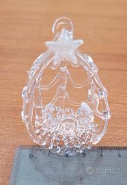 Vendo ornamento natalizio in vetro trasparente raffigurante una piccola scena stilizzata con stella superiore.