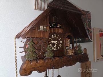 Bellissimo orologio a cucù in stile chalet, con movimento a 8 giorni. Direttamente dalla Germania, meccanismo regula. Automi, cuculo, e pendolo completamente in legno. Possibilità di mandare un video su richiesta. Cassa in legno finemente intagliata. Dettagli decorativi come alberi e ruota idraulica. Figure animate sul balcone. Meccanismo a 8 giorni per una carica settimanale. - 2 melodie diverse ad ognu rintocco (ora e mezz'ora)