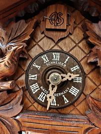 Bellissimo orologio a cucu tradizionale in legno originale della celebre azienda tedesca Anton Schneider. Come nuovo, perfettamente funzionante. Carica giornaliera, doppio carrillion alla mezzora e all’ora piena e possibile esclusione uscita cucu’ durante le ore notturne. Cornice superiore smontabile, quadrante e lancette orologio interamente in legno. Mai utilizzato per incompatibilità con l'arredamento.