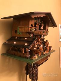 Bellissimo orologio a cucu originale acquistato nella foresta nera, carica giornaliera, doppio carrillion alla mezzora e all’ora piena, mulino in movimento, spaccalegna che muove il braccio, ballerini sul balconcino che girano, come nuovo, nel cartone originale usato pochissimo e riposto nell’imballo.