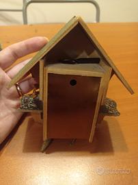 OROLOGIO A CUCU' MECCANICO raffigurante uno Chalet svizzero, lancette in legno, dipinto a mano. Movimento meccanico. Elemento in movimento è l'uccellino, pesi con pigne, balconcino a parapetto in rilievo. Assemblato manualmente, da fare riattivare. Si ricarica girando la chiave in dotazione, da riporre poi nell'apposito vano sul retro. Originale svizzero. Altezza: 13 cm, Larghezza: 10.5 cm, Profondità: 6 cm. Il prezzo è inclusivo di spese di spedizione