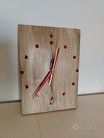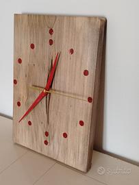 Orologio a parete interamente realizzato a mano in legno di catalpa, con inserzioni segna numeri in resina rossa, lancette rosse e meccanismo silenzioso