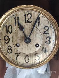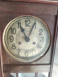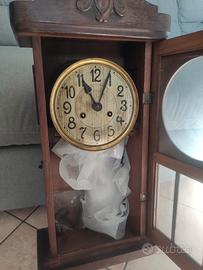 Orologio a pendolo in legno color noce perfettamente funzionante. Messo a nuovo da orologiaio professionista e datato intorno agli anni '60. Perfetto come arredo vintage o collezionisti