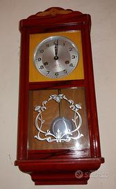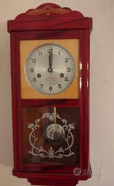 Orologio a pendolo da parete, in legno, movimento meccanico carica manuale, alla mezza fa un rintocco e all’ora fa i rintocchi delle ore, comprende la chiave di ricarica, anni 70. Misura HxLxP: cm 54x24x12, completamente originale e perfettamente funzionante, ottime condizioni.