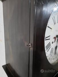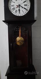 Orologio con calendario in piedi. Quadrante e movimento realizzati dalla Ansonia Clock Company. Orologio perfettamente funzionante, appena revisionato. Chiavetta di ricarica inclusa. Stile inglese del 1900. Struttura in legno duro con un grande cappuccio a forma di cupola e con un frontone ad arco di rottura. Un grande timpano vuoto sotto il frontone con il quadrante del calendario che si trova alla parte inferiore del cofano. Sotto il quadrante c'è una grande cornice orizzontale che sovrasta la cassa. Porta rettangolare con vetro astragalo, dal quale si può osservare l'arco del pendolo. Quadrante rotondo bianco con anello del capitolo delle ore romane smaltato di nero, binario dei minuti a barra chiusa, indici arabi per il calendario 1-31, lancette in acciaio. Scomparto speciale di due lastre di legno per contenere il movimento di lastre di ottone fenestrate. Il movimento rettilineo a telaio aperto in ottone con pilastri che collegano le piastre anteriore e posteriore. La ruota di scappamento sarebbe sul piatto anteriore, con un volano ed eventuale contaruota per battere le ore. Il tutto è alimentato da due molle in acciaio che garantiscono una durata di sette giorni. Relativi numeri di rintocchi delle ore e rintocco singolo ogni mezz'ora. Dimensioni: H 184 - L 44 - P 31.