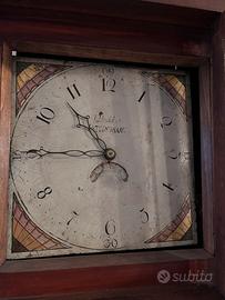Elegante orologio a pendolo da pavimento, realizzato in legno massello con finiture artigianali e cassa slanciata. Quadrante originale dipinto a mano con numeri romani e firma del costruttore J. Badd, Nottingham, che lo colloca in Inghilterra, probabilmente nella prima metà dell’Ottocento.