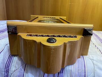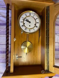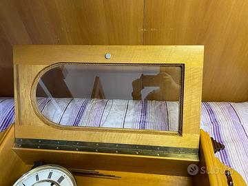 Vendo orologio a pendolo artigianale, realizzato a mano da mio zio negli anni ’90. Struttura in legno massello, pendolo in ottone, quadrante con numeri romani, vetro decorato e suoneria a martelletti.