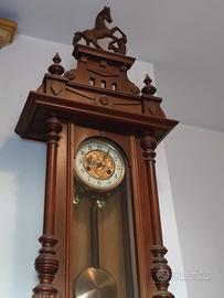 Antico orologio a pendolo con cavallo del 1900. in legno intagliato