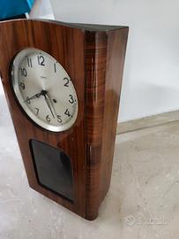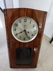 Vendo orologio a pendolo da parete Kaiser, originale e d’epoca, risalente probabilmente agli anni ‘50-‘70. Si tratta di un classico modello in legno con finitura lucida, dotato di quadrante in metallo e numeri arabi ben leggibili.