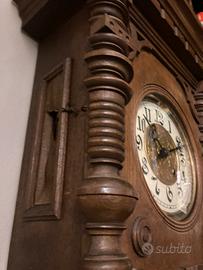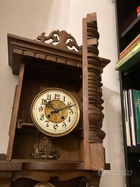 Perfettamente funzionante in legno pregiato tornito e intagliato. Si apre la porta davanti per poterlo ricaricare. Il pendolo e’ esterno meravigliosamente inciso Misura :86 cm di altezza. 36cm di larghezza 22cm di profondita’. Tel393 9101610. Solo se interessati.