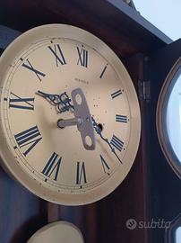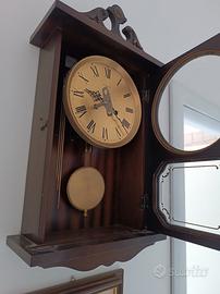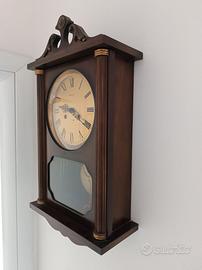 Splendido orologio a pendolo da parete a marchio Kienzle, celebre manifattura tedesca sinonimo di precisione e stile. L'orologio presenta una raffinata cassa in legno color noce con eleganti decorazioni sulla cimasa superiore e colonnine laterali. Il quadrante ha indici in numeri romani ed è protetto da un vetro curvo. Nella parte inferiore è visibile il pendolo attraverso un vetro decorato con profili dorati. Marca: Kienzle (Made in Germany) Misure: 56 x 31 cm. Stile: Classico / Vintage Materiale: Legno e metallo Condizioni: perfette, chiave di carica originale Ideale come complemento d'arredo per ingressi, saloni o per appassionati di orologeria d'epoca.