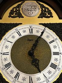 Propongo in vendita un orologio a pendolo da parete marca Tempus Fugit, in legno scuro con dettagli dorati.
