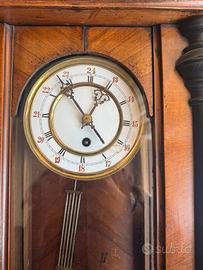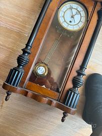 Elegante orologio a pendolo da parete antico in legno massello, con cassa in noce e dettagli in ebanizzato nero. Il design è arricchito da colonne tornite, frontone triangolare e decoro centrale a rilievo. Quadrante in smalto bianco con numeri romani e scala delle 24 ore, lancette lavorate in metallo e pendolo in ottone lucido visibile attraverso la porta in vetro. Misure 40x70 circa