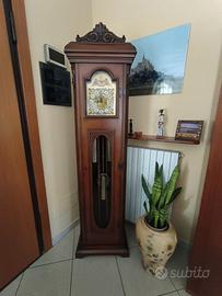 Vendo elegante orologio a pendolo da pavimento, realizzato in legno massello con dettagli intagliati e finiture di pregio. Il quadrante decorato presenta numeri romani, un’illustrazione artistica e meccanismo a pesi con suoneria.