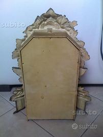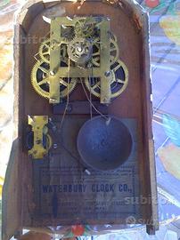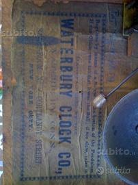 Orologio a pendolo da tavolo WATERBURY CLOCK CO. Allinterno è scritto a matita Pat. May 10 1859. La medesima indicazione è riportata stampata sul perimetro del quadrante,visibile solo quando lo sportellino è aperto. Orologio perfettamente funzionante presenta anche il dispositivo di sveglia. Suona le ore. La parte anteriore dovrebbe essere in antimonio ma non ne sono sicuro. Orologio raro per il mercato italiano. La parte posteriore è stata verniciata in bianco (ora più scuro a causa del tempo trascorso). Ha la sua chiave di carica. Sprovvisto di vetrino a nello sportellino in basso ove si vede il movimento del pendolo. Questultima apertura serve a far muovere manualmente il pendolo nel caso terminasse la carica. Misure (hxlxp) 48x36x14