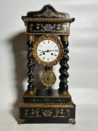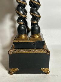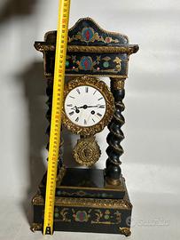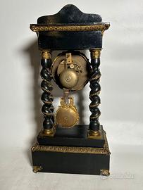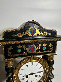 orologio a pendolo di epoca Impero, di provenienza francese, caratterizzato da eleganti intarsi che ne arricchiscono la facciata. Questo orologio rappresenta un esemplare raffinato dell'arte orologiera del periodo Impero, noto per il suo design solenne e classico. Perfettamente funzionante, si distingue per la sua bellezza e precisione, essendo un complemento d'arredo di grande valore storico e estetico.