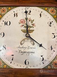 Vendo importante orologio a pendolo inglese (longcase clock) risalente alla seconda metà del XVIII secolo (circa 1770–1790). L’orologio presenta: •Quadrante originale dipinto a mano con decorazioni floreali policrome •Firma sul quadrante: “Joshua Crane – Bromsgrove”, noto orologiaio inglese del ‘700 •Cassa alta circa 2,80 metri, in legno pregiato, con raffinati intarsi floreali nella base •Movimento meccanico a pesi e pendolo, tipico dell’epoca •Anta frontale e superiore originali Pezzo autentico e di grande presenza scenica, ideale per collezionisti, antiquari o ambienti di prestigio. Visionabile di persona