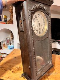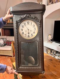 Antico orologio da muro a pendolo completo di tutte le componenti e perfettamente funzionante. In legno di noce reataurato.