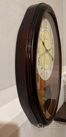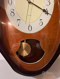 Orologio a pendolo da parete, Luren Quartz praticamente Nuovo è rimasto sempre nella sua scatola. È alto 55 cm larghezza 36 cm, spessore 7,5 cm . Il pendolo funziona eccellentemente, ogni ora suona due volte la melodia del Big Ben e successivamente i rintocchi rispetto l’ora corrente. Se si desidera annullare i rintocchi, cioè la suoneria appena descritta, basterà togliere le due pile stilo che lo alimentano. Poi c’è un’altra pila stilo che alimenta l’orologio, il movimento e un’altra pila stilo che alimenta l’oscillazione del pendolo che è separata autonoma rispetto il movimento che assegna l’ora. L’oscillazione del pendolo non determina l’avanzamento delle ore dei minuti ma è puramente un completamento dell’Orologio. Posteriormente è presente il meccanismo che permetterà la regolazione dell’ora e la sincronizzazione con i rintocchi che attualmente ho già praticato per cui corrispondono perfettamente. La Cornice è l’intero Orologio e fatto di Legno anche il quadrante che è colorato bordato ornato di colore oro con uno sfondo color marroncino rosso di Pozzuoli e su ambo i lati compaiono 2L maiuscole in corsivo. Il quadrante dell’ora è un ovale con un altro vale concentrico più piccolo tutte e due contornati da un bordino dorato. Evito di spedirlo per la delicatezza dell’oggetto e potrete visionarlo e ritirarlo al mio domicilio. Veramente bello e perfettamente funzionante.