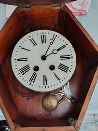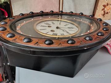 Vendo bellissimo orologio antico da parete, Occhio di bue, a pendolo, con chiave per ricarica. La cassa in legno è in ottime condizioni; il meccanismo dell' orologio è funzionante, mentre la corda della suoneria è da aggiustare.