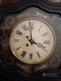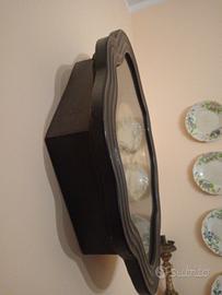 Orologio da muro di fine '800 in legno, con cornice mossa, quadrante tondo in carta con numeri romani lancette in lamierino, mancante della chiave originale per ricaricarlo conosciuto come "Occhio di Bue". Oggeto ormai fermo da tanti anni perciò il meccanismo è da rivedere e revisionare. Il prezzo chiesto s'intende già compreso di spedizione che sarà postale in espresso con tracciabilità PREFERIBILE, SE POSSIBILE, RITIRO A MANI