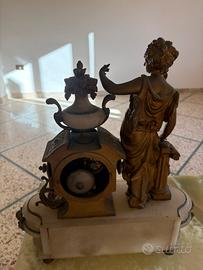 Raffinato orologio da appoggio della seconda metà del XIX secolo, con struttura in pregiato alabastro bianco venato e scultura in regula dorata raffigurante una musa in posa classica. Il quadrante con numeri romani è racchiuso in una ghiera di bronzo lavorato e sormontato da un'anfora ornamentale. Sul retro è visibile il movimento meccanico originale con suoneria a campana. Il pezzo conserva la patina d'epoca e ottime condizioni estetiche, ideale come elemento centrale per arredi di prestigio o studi professionali.