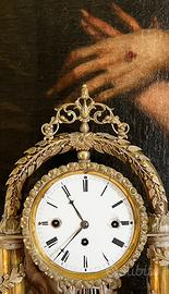 Dettagli Ornati: Caratterizzato da colonne laterali lavorate, un maestoso motivo decorativo a lira con teste di cigno e ghirlande finemente cesellate che sormontano il quadrante.