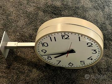 Vendo Orologio bifacciale tondo da parete alimentato a batteria con movimento radio controllato spesso usato su locali pubblici,, attacco al muro con piastra quadra (vedi foto) colore grigio, materiale plastica vetro (bombato) metallo misure diametro 32 X 10 cm