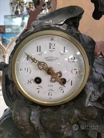Particolare orologio da tavolo in metallo patinato, con base in marmo screziato, raffigurante una donna alata e un cavallo. Sul fronte è presente una targhetta con la seguente dicitura " La Renommeè Par X. Raphanel". In perfette condizioni. Non si danno garanzie sul funzionamento.