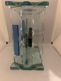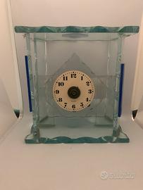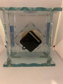 Elegante orologio da tavolo con struttura in vetro trasparente e decorazioni interne.