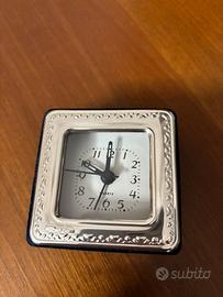 Orologio da comodino mai usato, con cornice in argento 925 e dietro in velluto blu, con funzione sveglia misura cm 6x6x3