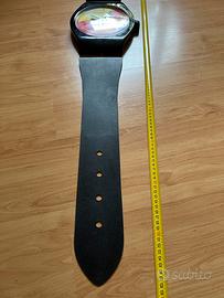 Orologio da parete fuori dal comune, a forma di gigantesco orologio da polso. Lunghezza totale circa 140 cm. Quadrante sfumato nei toni arancio, giallo, rosso e blu, cinturino in plastica nera. Movimento al quarzo (funziona con una batteria AA).