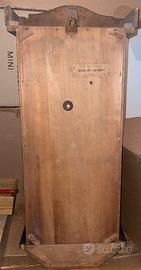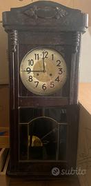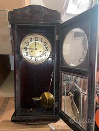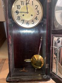 Antico orologio a pendolo da parete metà '900. Materiale Legno con vetri inferiori, funzionamento meccanico con chiave di carica, tempo e suoneria, oggetto vintage modernariato. L’orologio è funzionante. Dimensioni: - altezza cassa: 81cm - larghezza: 35cm - profondità: 18cm