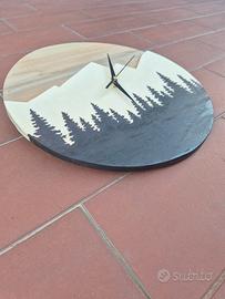 Vendo orologio da parete in legno di abete, con disegno di una foresta con sfondo le montagne stile 3D. Diametro 30cm.