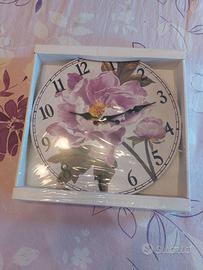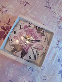Vendo un orologio da parete nuovo ancora sigillato nella sua confezione originale. Mai aperto. Colore bianco von un grande fiore viola al centro, lancette e grandi numeri in nero. Molto carino ideale per arredamento. Diametro 33 cm.