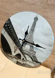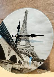 Orologio da muro in vetro temperato con elegante stampa in bianco e nero raffigurante la Torre Eiffel e il ponte di Bir-Hakeim. Un oggetto decorativo raffinato e funzionale, ideale per arredare con stile soggiorni, studi o uffici.