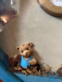Cornice in legno azzurro, scena 3D con orsetto, carriola con fiori e sfondo murale effetto