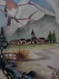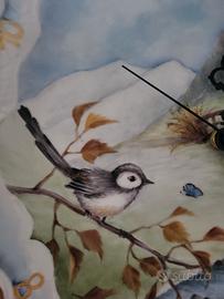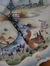 Orologio di ceramica dipinto a mano da artista. Tema naturale, riprende le 4 stagioni. Lancette gotiche. Completo di ganci per appenderlo. Diametro cm 32,5