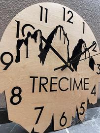 Orologio creato artigianalmente con legno di tiglio e acrilico nero. Dedicato ad uno dei simboli delle Dolomiti, le Tre Cime di Lavaredo, si presenta come un orologio elegante adatto a qualsiasi ambiente.