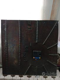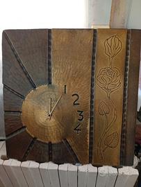 orologio da parete in ottone lavorato a mano. con disegno di rose, i numeri dall' 1 al 4 e i raggi del sole opposti alla rosa. l'orologio rappresenta il sole. misura 40cm è di forma quadrata. Funziona