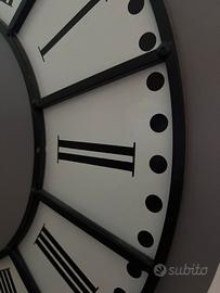 Quadrante ampio con numeri romani neri su sfondo chiaro, cornice scura e lancette lavorate: un mix perfetto tra stile vintage, industrial e classico moderno.