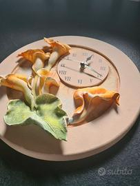 Orologio da parete decorato a mano, con motivo floreale colorato: calle in rilievo. Lo stile ricorda quello Thun. Quadrante rotondo con cifre in caratteri romani. Movimento al quarzo, alimentazione con una batteria AA. Diametro esterno 29 cm.