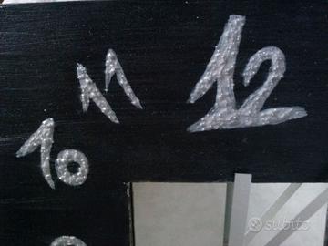 Orologio da parete di fattura artigianale. E' stato utilizzato un quadro con specchio decorato a mano con colori acrilici e finitura di protezione. I numeri sono in pittura materica colore in madreperla con sferette. Terminata e fissato il decoro è stato inserito il meccanismo per l'orologio. La cornice misura cm 25.5x25.5, è profondo cm 2.5 compreso il meccanismo.