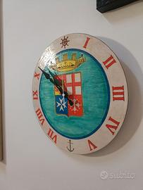 Vendo elegante orologio da parete dedicato alla Marina Militare Italiana, realizzato su base in legno inciso e dipinto a mano con grande cura nei dettagli.