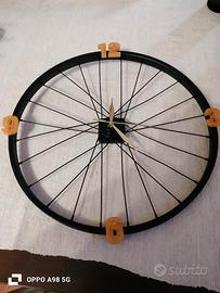 Orologio da parete realizzato con raggi e ruota bicicletta e numeri in resina epossidica