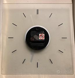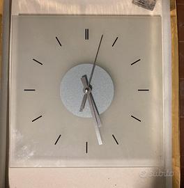 Orologio da parete in vetro, con tacchette nere e lancette color argento. Forma quadrata, dimensioni circa 30 cm.
